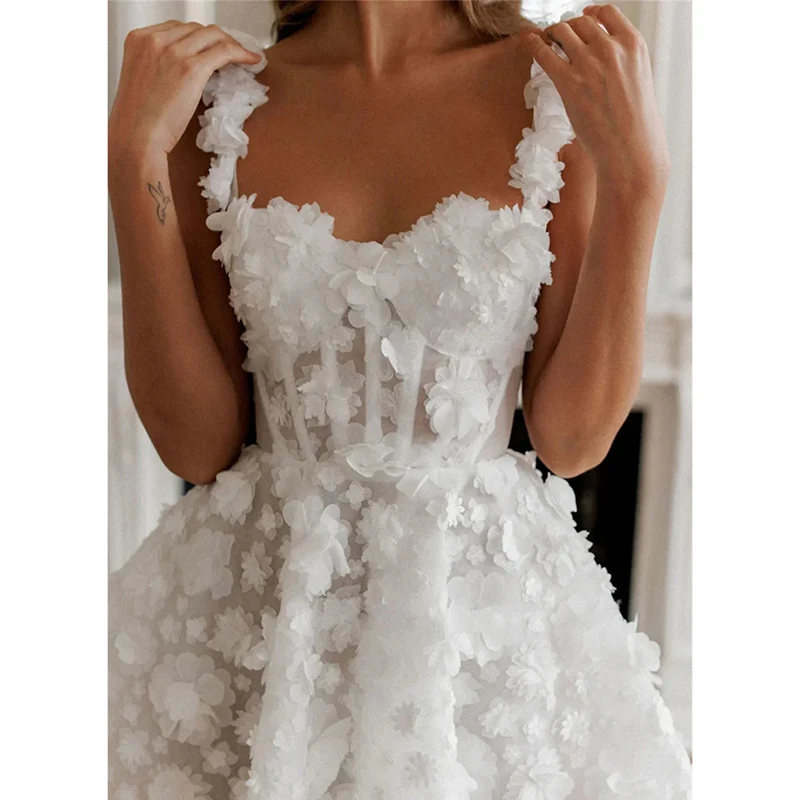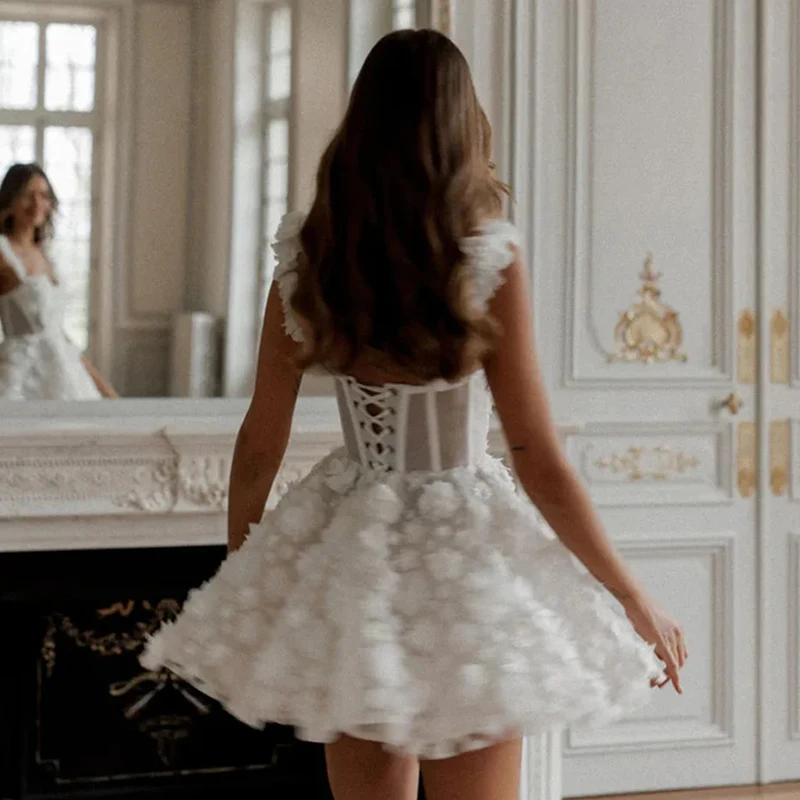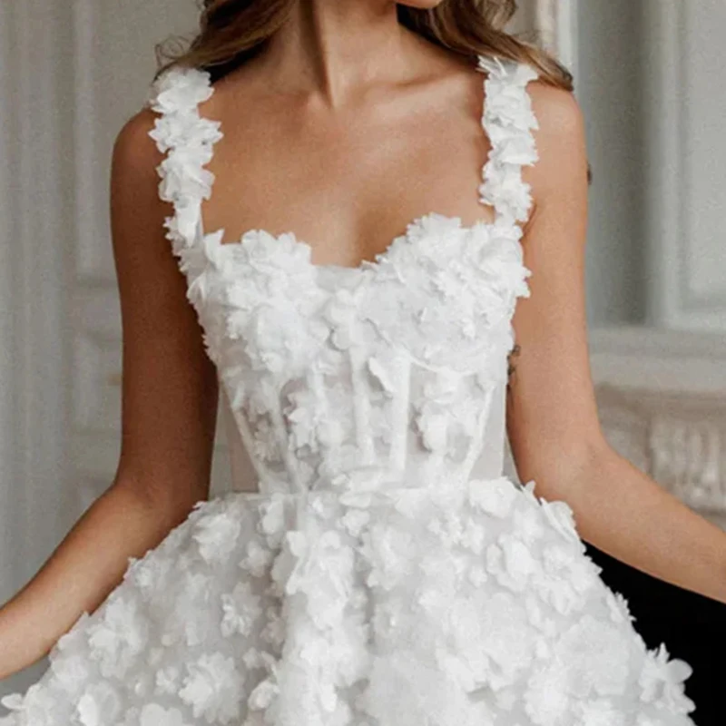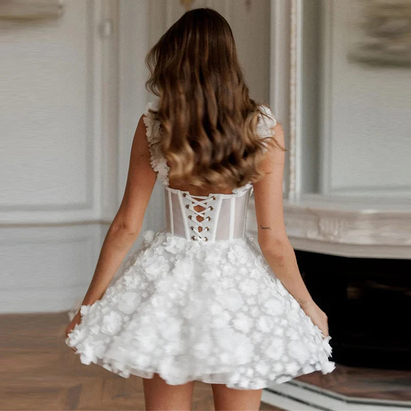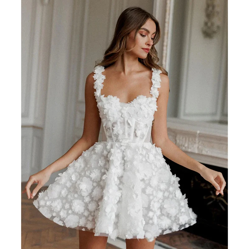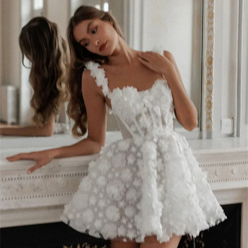Sophisticated White Short Wedding Dress with 3D Floral Embellishment Prom Dresses Square Neckline Sleeveless Cocktail Dress