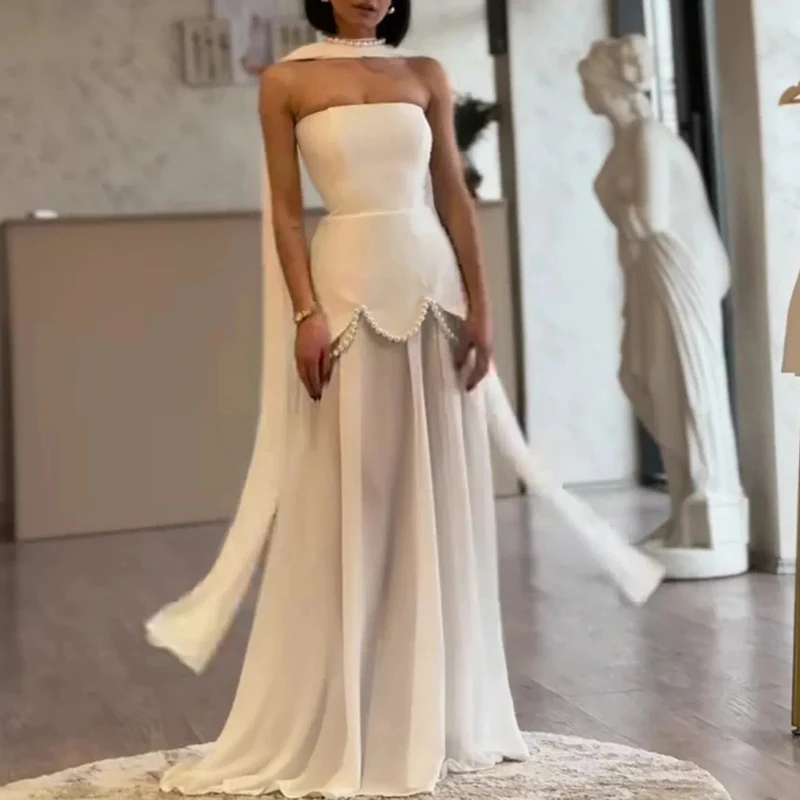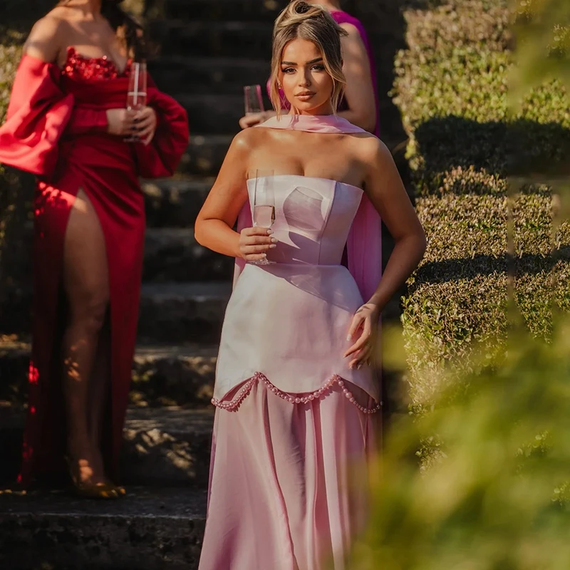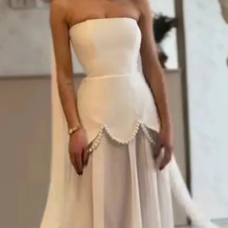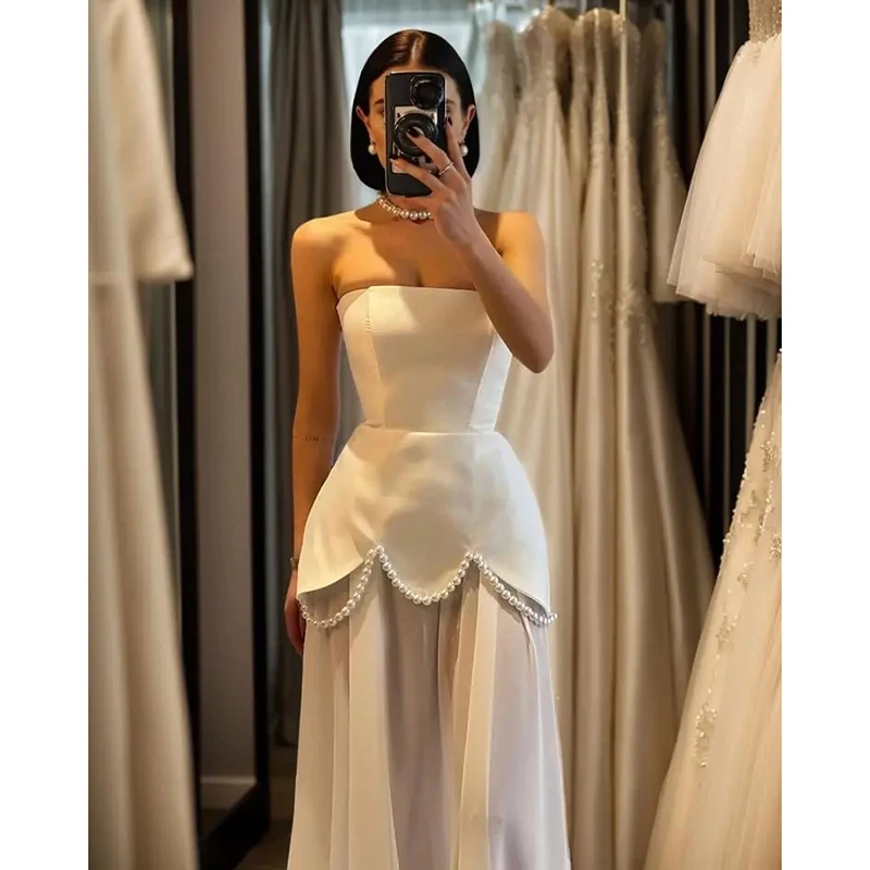 Strapless Satin Evening Gown with Sheer Skirt Elegant Pearl Embellishments Floor – Length Prom Dress for Wedding Party Dress